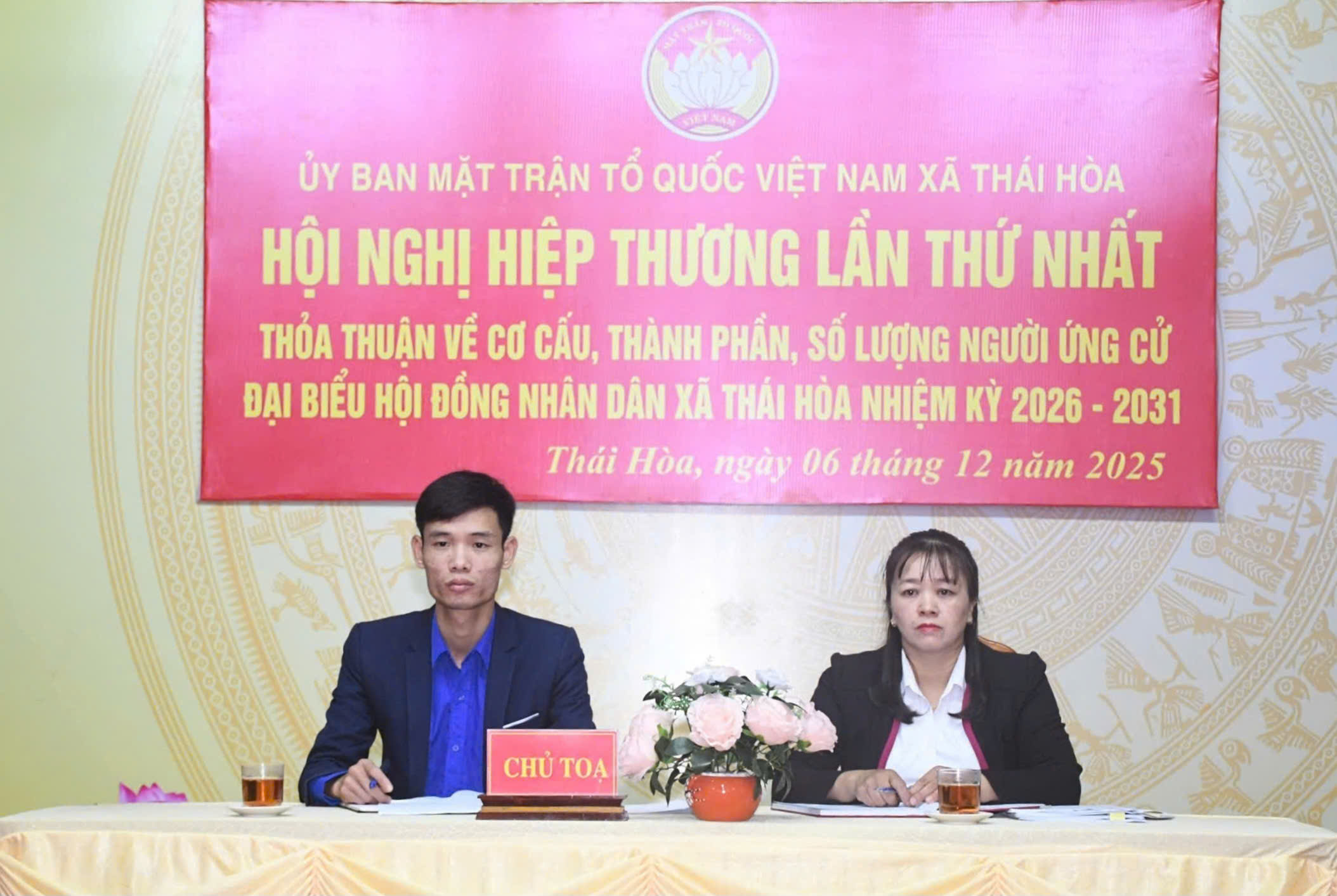 Ngày 06/12/2025, Ban Thường trực Ủy ban MTTQ Việt Nam xã Thái Hòa tổ chức Hội nghị hiệp thương lần thứ nhất để thỏa thuận về cơ cấu, thành phần, số lượng người ứng cử đại biểu HĐND xã Thái Hòa, nhiệm kỳ 2026–2031. Dự hội nghị có đồng chí Lã Văn Hào, Phó Bí thư Thường trực Đảng uỷ, Chủ tịch HĐND xã Thái Hòa; đồng chí Trần Vũ Hưng, Phó Bí thư Đảng uỷ, Chủ tịch UBND xã, Chủ tịch Uỷ ban Bầu cử; thường trực UB MTTQ Việt Nam và đại diện các tổ chức thành viên.