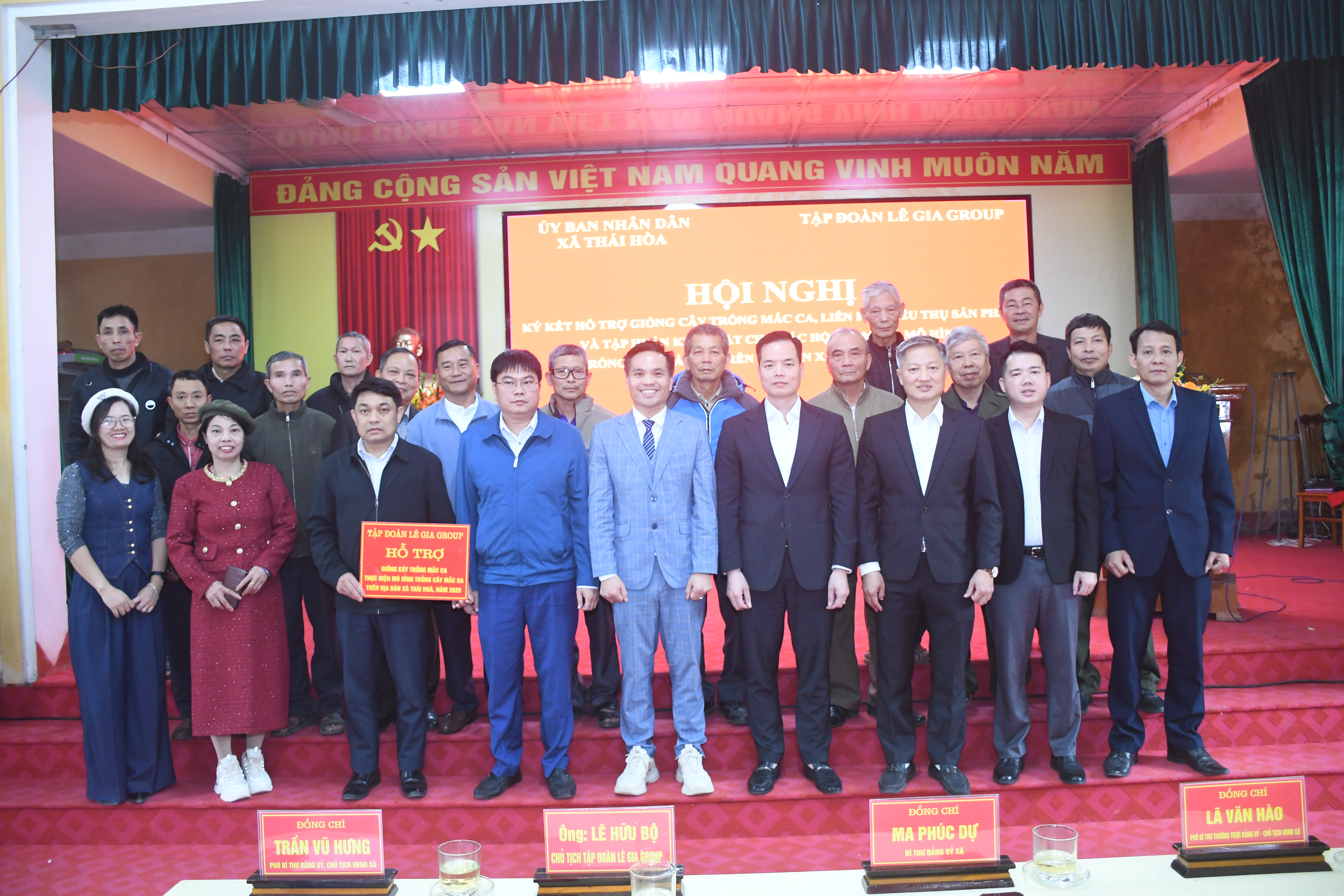 Chiều ngày 16/1, UBND xã Thái Hòa đã tổ chức hội nghị phối hợp với Tập đoàn Lê Gia Group về việc ký kết thỏa thuận hỗ trợ trồng cây Mắc ca và ký hợp đồng liên kết tiêu thụ sản phẩm cho các hộ dân tham gia mô hình trên địa bàn xã. Dự hội nghị có các đồng chí Ma Phúc Dự, Bí thư Đảng ủy; Lã Văn Hào, Phó Bí Thường trực Đảng ủy, Chủ tịch HĐND xã; Trần Vũ Hưng, Phó Bí thư đảng ủy, Chủ tịch UBND xã; cùng lãnh đạo Tập đoàn Lê Gia Group.