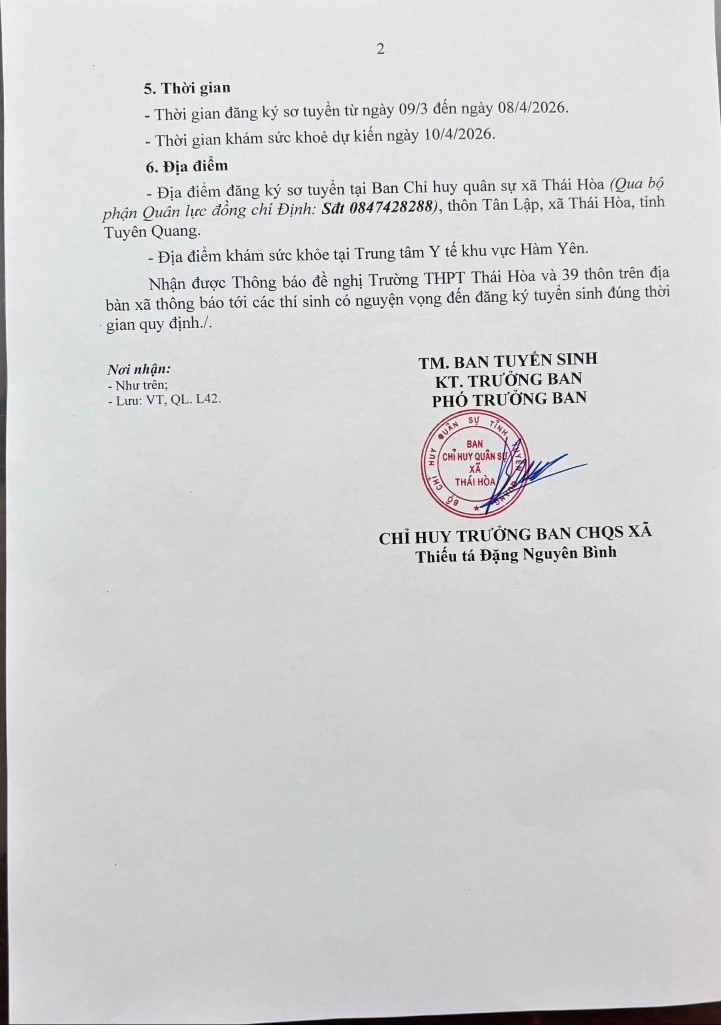 BAN TUYỂN SINH QUÂN SỰ XÃ THÁI HOÀ TRÂN TRỌNG THÔNG TIN VỀ TUYỂN SINH QUÂN SỰ NĂM 2026